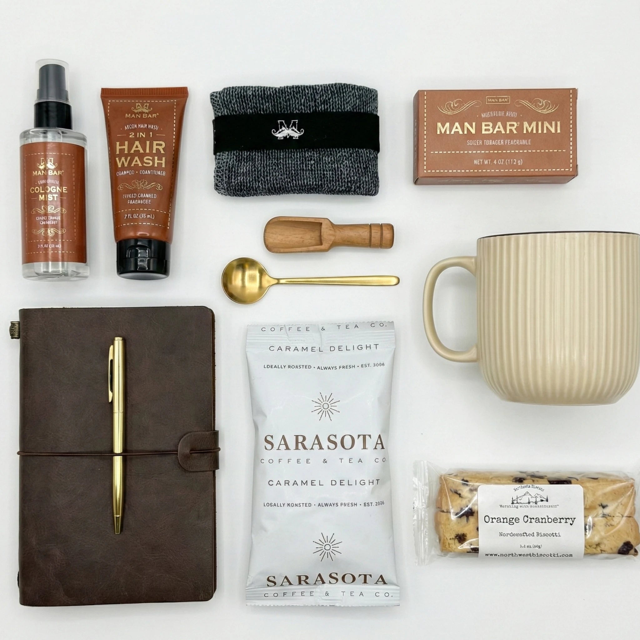This isn't just a gift box; it's a complete morning ritual. The masculine scent of spiced tobacco in the spa products sets a confident tone, while the artisan coffee and biscotti provide a delicious start to the day. Paired with a classic leather journal, it invites him to slow down and focus on what matters.